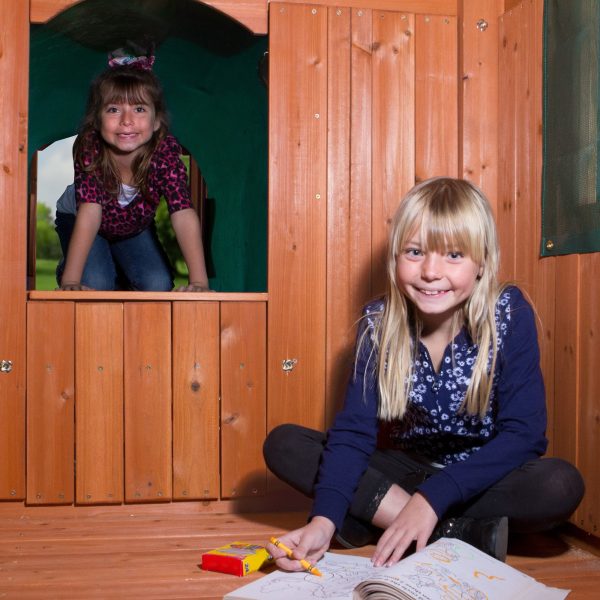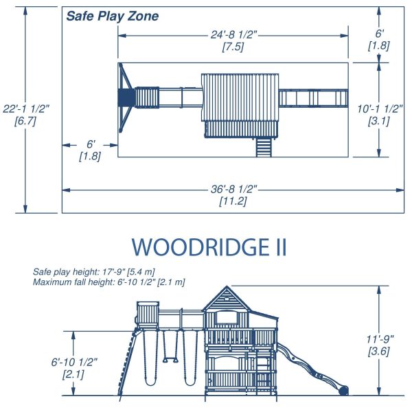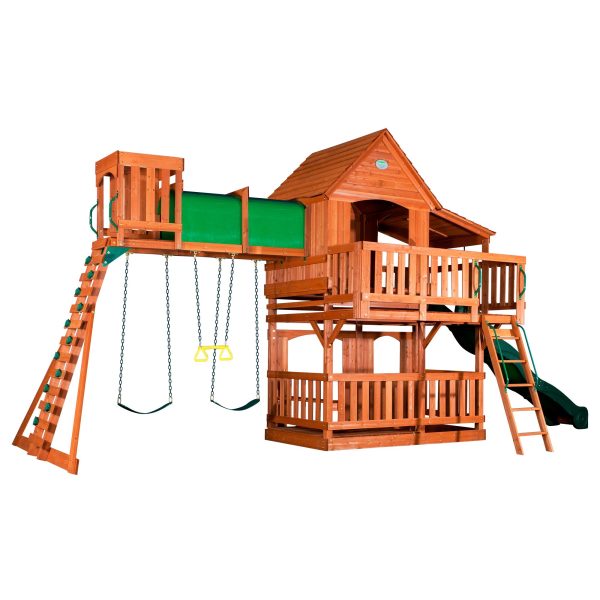 One of our best sellers, the Woodridge is decked out with a sprawling top level and expansive lower fort. The whole block has room to play between the raised clubhouse, covered side porch with sandbox area, open sun porch, elevated tunnel, sizable crows nest, and roomy lower fort. The stepladder, rock wall ladder and 10ft. wave slide provide plenty of fun entry and exit routes as the crowd darts from level to level. After so much running and chasing, the built-in bench, two belt-swings and trapeze provide a more relaxing alternative for those in need of a break. Made to weather the biggest broods, the Woodridge II will supply any and all families with years of fun.
