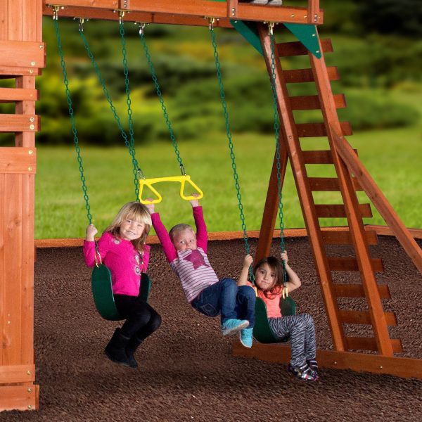 The Woodridge II is made from 100% cedar. With small, tight knot structure, your lumber will be less likely to develop small cracks emanating from knots. In laboratory testing, our durable cedar wood proved to be rot resistant and highly resistant to natural decay. All lumber is pre-stained for a smooth and clear appearance, as well as cut and stamped with the part number to help speed up the building process. Some pilot-hole drilling may be required. Our exclusiveSafe-T-Fuse hardware makes assembly easy and secure. Its laminated swing beam is built strong, with steel clam-shell brackets to ensure that swinging is always safe.